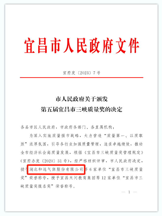 喜報(bào)!和遠(yuǎn)氣體榮獲第五屆“宜昌市三峽質(zhì)量獎(jiǎng)”